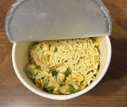 油揚げめん(小麦粉(国内製造)、植物油脂、食塩、小麦たん白)、かやく(キャベツ、コーン、ねぎ)、添付調味料(食塩、粉末野菜エキス、チキンエキス、ごま、たん白加水分解物、香辛料、砂糖、植物油脂、豚脂)/加工でん粉、調味料(アミノ酸等)、炭酸Ca、乳化剤、増粘多糖類、かんすい、着色料(クチナシ黄色素)、酸化防止剤(ビタミンE)、香料、(一部に乳成分・小麦・大豆・鶏肉・豚肉・ゼラチン・ごまを含む)