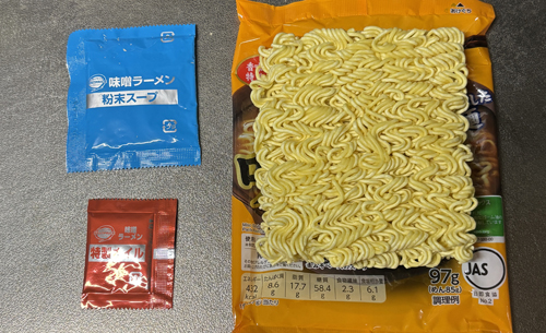 油揚げめん[小麦粉(国内製造)、植物油脂、食塩、しょうゆ(小麦・大豆を含む)、香味調味料(乳成分・小麦・大豆・鶏肉を含む)]、スープ[みそ調味料(小麦・大豆を含む)、食塩、砂糖、香辛料(乳成分・小麦を含む)、粉末みそ(大豆を含む)、ポーク調味料(乳成分・大豆・鶏肉・ゼラチンを含む)]、特製オイル(植物油脂)