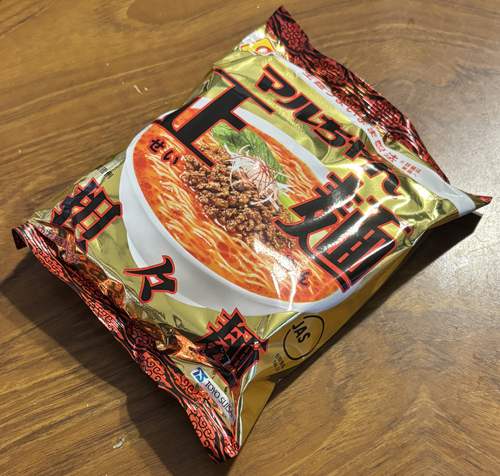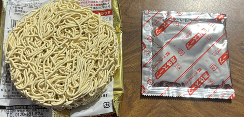 めん(小麦粉(国内製造)、植物油脂、食塩、植物性たん白、卵白)、添付調味料(ポークエキス、砂糖、みそ、ねりごま、ラード、しょうゆ、食塩、豆板醤、たん白加水分解物、香味油脂、りんご酢、香辛料)/加工でん粉、酒精、調味料(アミノ酸等)、トレハロース、かんすい、炭酸カルシウム、乳化剤、カラメル色素、酸化防止剤(ビタミンC、ビタミンE)、クチナシ色素、パプリカ色素、香辛料抽出物、(一部に小麦・卵・ごま・大豆・豚肉・りんごを含む)