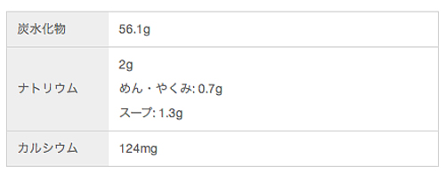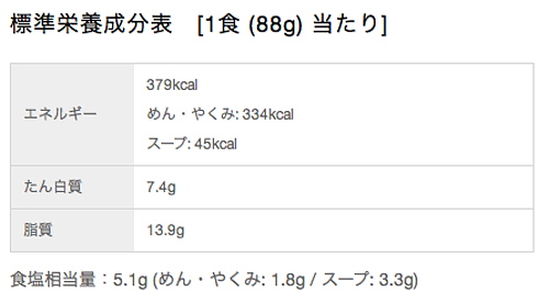原材料:油揚げめん(小麦粉、植物油脂、食塩、醤油)、スープ(食塩、醤油、植物油脂、豚脂、糖類、香辛料、ポークエキス、香味油、ねぎ、昆布パウダー、魚介調味油、酵母エキス)、加工でん粉、調味料(アミノ酸等)、かんすい、炭酸Ca、カラメル色素、香料、カロチノイド色素、酸化防止剤(ビタミンE)、香辛料抽出物、(原材料の一部に乳成分、鶏肉、ごまを含む)
