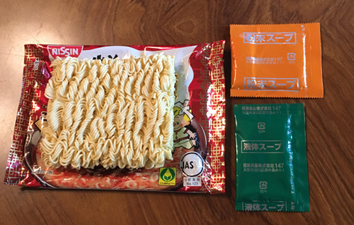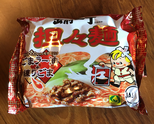油揚げめん(小麦粉、植物油脂、食塩、醤油、ポークエキス)、スープ(食塩、ねりごま、たん白加水分解物、植物油脂、糖類、ごま、ポークエキス、香辛料、豆板醤、香味油)、調味料(アミノ酸等)、炭酸Ca、かんすい、増粘多糖類、カラメル色素、乳化剤、酸味料、カロチノイド色素、酸化防止剤(ビタミンE)、香料、ビタミンB2、香辛料抽出物、ビタミンB1、(原材料の一部に落花生を含む)