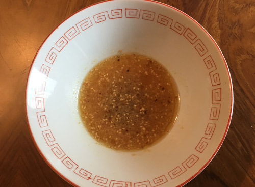 スープ(香味油、食塩、糖類、植物油脂、鶏・豚エキス、香味調味料、たん白加水分解物、ごま、香辛料、貝エキス、酵母エキス、蝦醤、フライドオニオン)、調味料(アミノ酸等)、酒精、かんすい、増粘多糖類、香料、微粒二酸化ケイ素、クチナシ色素、酸味料、乳化剤、カラメル色素、香辛料抽出物、(原材料の一部に卵、乳成分、えび、さけ、さば、ゼラチンを含む)