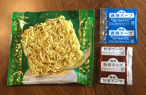 麺はノンフライ麺、液体スープと粉末スープ。