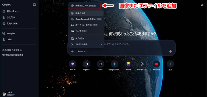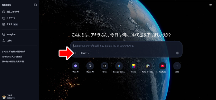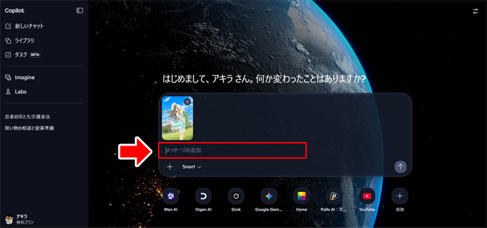 最初はWindows標準のブラウザー「Bing」のAI「Copilot」をひらきます。