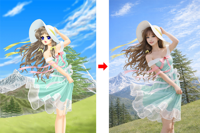 アニメタッチなどで描かれたイラストを、まるでこちらの世界に息づいているかのようなリアリティなキャラクターに、最新のAI技術を使って、驚くほど生々しい「実写」へと変貌させました。
