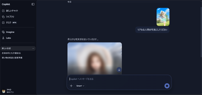画像のアップロードが終わったら、メッセージ入力エリアに「リアルな人間の写真画像に変換して」とプロンプトを入力します。